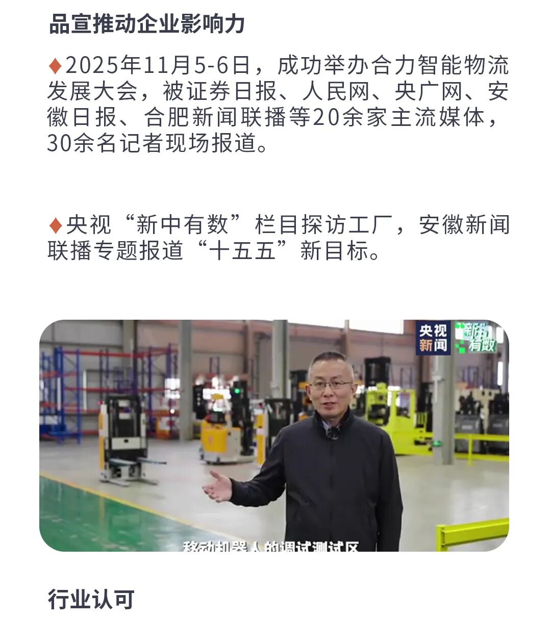安徽合力宇锋智能科技有限公司(简称“合力宇锋”),是安徽合力股份有限公司(股票代码600761)的控股子公司,也是国家“科改示范”企业。总部位于合肥,上海、苏州设立分公司,先后荣获国家高新技术企业、国家级专精特新“小巨人”企业、中国智能物流推荐品牌等荣誉。