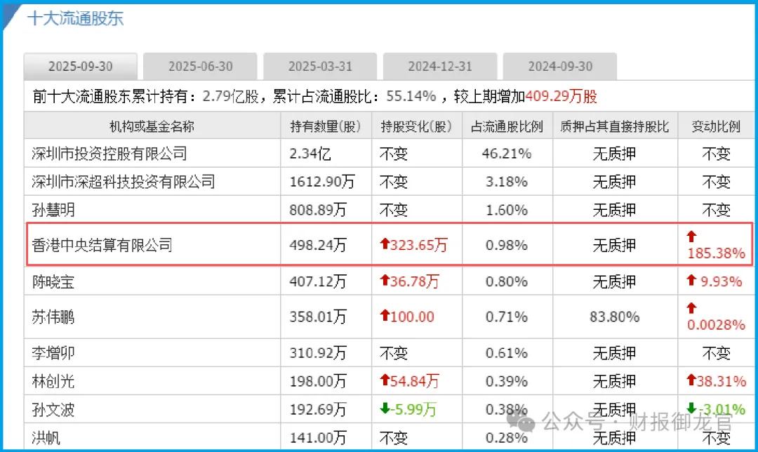 财官的加密线路,收到一份标注“矛盾等级:最高”的简报。简报核心是一组不可能共存的数据:深纺织A,2025年三季报净利润5944.52万元,同比下降24.66%。典型的衰退信号。然而,附页的股东异动记录却显示,香港中央结算有限公司在此期间暴力加仓185%。$深纺织A(000045)