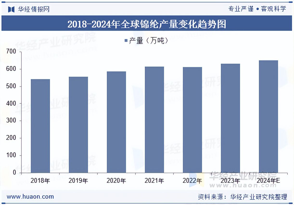 在全球锦纶市场中,锦纶6和锦纶66的产能与产量占比超过95%。锦纶66的生产技术及生产规模主要被美国、英国、法国、意大利、德国、日本等发达国家和地区所掌握。在海外,英威达、奥升德、杜邦、巴斯夫、兰蒂奇、旭化成等是主要的生产商,其中英威达公司的生产规模位居首位。近几年全球锦纶产量稳步增长,2023年全球锦纶行业产量约为630.17万吨,同比增长3.11%。
