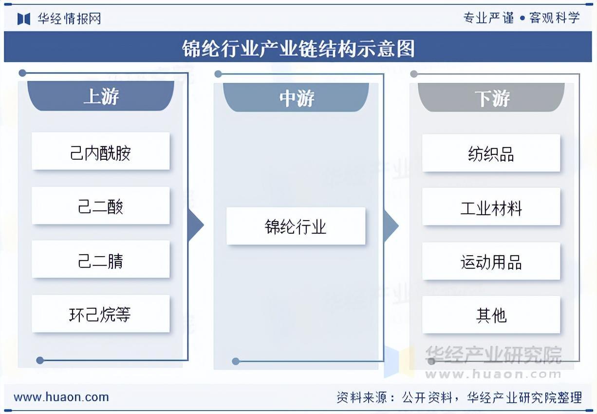 锦纶行业的产业链上游主要是原材料的生产与供应,关键原材料包括化学品和石化产品,如己内酰胺、己二腈和环己烷等。其中,己内酰胺是生产锦纶6的主要原料,而己二腈和己二酸则是生产锦纶66的关键原料,环己烷则被用于己内酰胺和己二酸的生产过程。锦纶行业的下游应用领域广泛,涵盖纺织品、工业材料以及运动用品等多个领域。