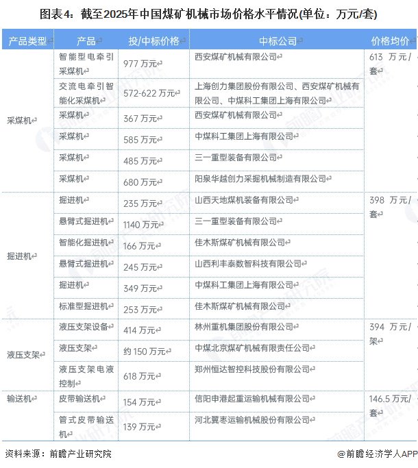 根据公开投中标信息对煤矿机械市场价格的搜集,各类型煤矿机械产品的价格水平如下所示,从汇总情况得知,采煤机价格均价约为614万元/套,掘进机价格约为398万元/套。液压支架设备约为394万元/架,输送机约为146.5万元/套。