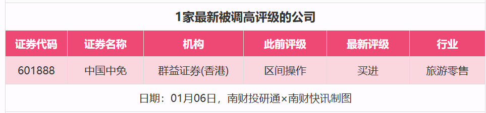 评级调高方面,1月6日,券商调高上市公司评级达到1家次,群益证券(香港)对中国中免的评级从“区间操作”调高至“买进”。