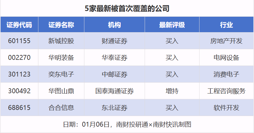 首次覆盖方面,1月6日券商共给出了5次首次覆盖,其中新城控股获得财通证券给予“买入”评级,华明装备获得华泰证券给予“买入”评级,奕东电子获得中邮证券给予“买入”评级,华图山鼎获得国泰海通证券给予“增持”评级,合合信息获得东北证券给予“买入”评级。