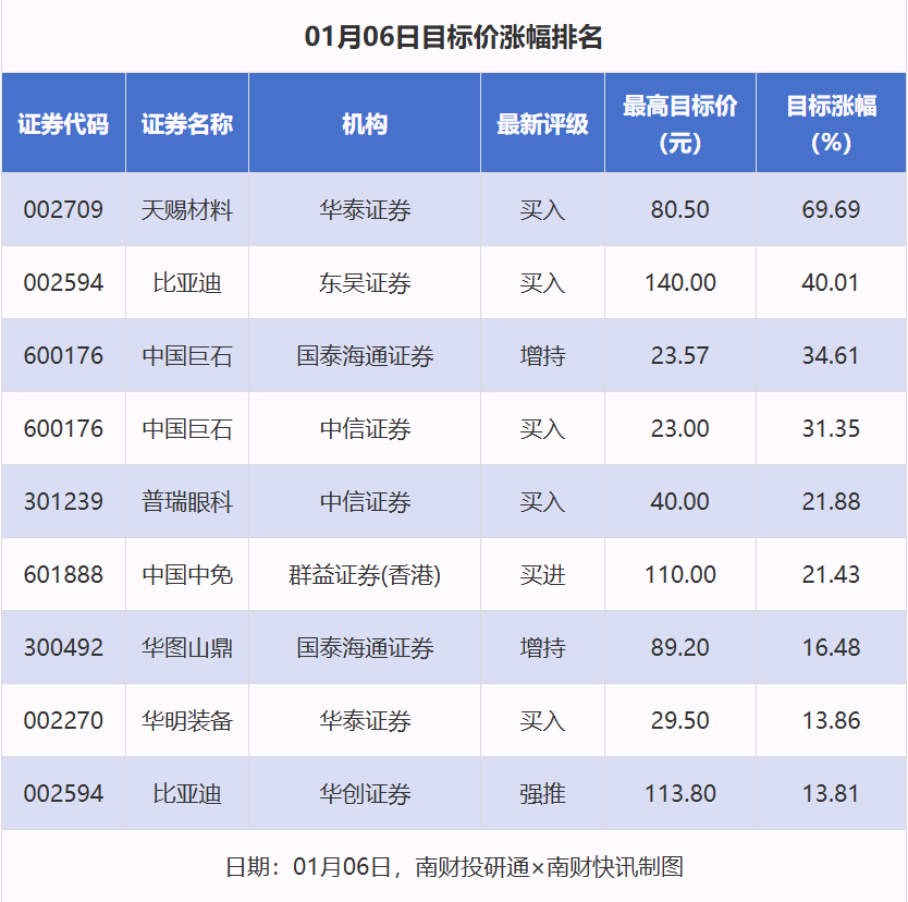 南财投研通数据显示,1月6日,券商给予上市公司目标价共9次,按最新收盘价计算,目标价涨幅排名居前的公司有天赐材料、比亚迪、中国巨石,目标价涨幅分别为69.69%、40.01%、34.61%,分别属于电池、乘用车、玻璃玻纤行业。