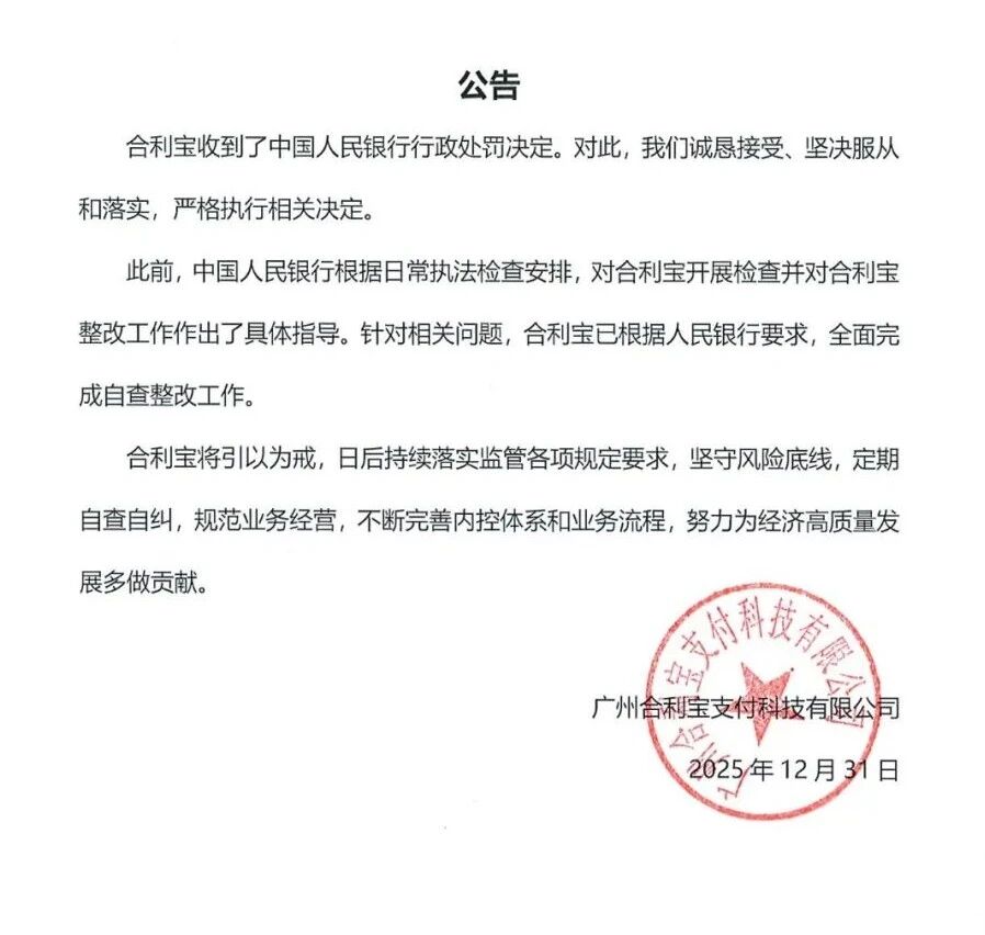 对于多项违规被央行重罚,*ST仁东近日发布公告回应称,合利宝支付已完成上述罚款缴纳,目前公司生产经营活动正常。合利宝支付也在其官方微信公众号上回应称,“诚恳接受、坚决服从和落实,严格执行相关决定”。