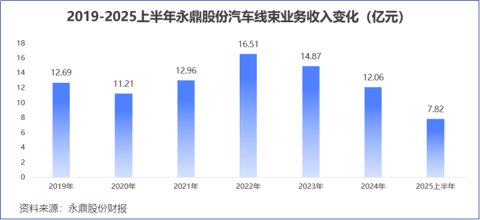 2019年,永鼎股份来自汽车线束的收入为12.69亿,2022年巅峰时期,该业务营收增至16.51亿。后面不增反降,减少至12.06亿元。