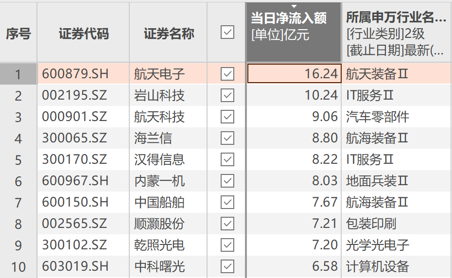 上证报中国证券网讯(记者 徐蔚)Choice数据显示,1月8日,资金净流入额排名前十的个股依次是:航天电子、岩山科技、航天科技、海兰信、汉得信息、内蒙一机、中国船舶、顺灏股份、乾照光电、中科曙光。其中,航天电子、岩山科技净流入超10亿元。