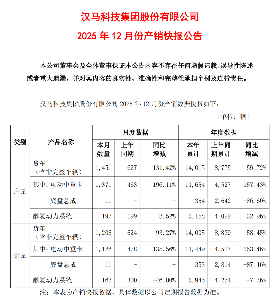 日前,汉马科技发文,宣布自2025年12月31日起,全面停止在中国境内市场的传统燃油整车生产与销售,专注新能源、清洁能源汽车业务。汉马科技是国内首批宣布停产燃油车的重卡企业之一。不过,海外市场传统燃油车销售业务暂不受影响。