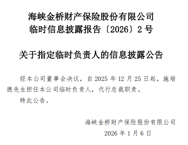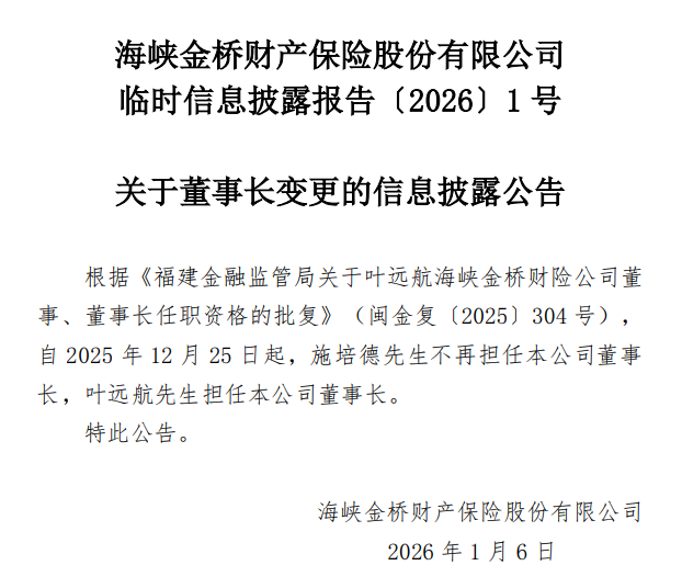 值得关注的是,自2021年6月沈庆宏不再担任海峡保险总经理以来,该公司总经理一职一直处于缺位状态。1月6日,海峡保险连发两则公告称,自2025年12月25日起,施培德不再担任公司董事长,出任临时负责人,代行总裁职责;叶远航担任公司董事长。