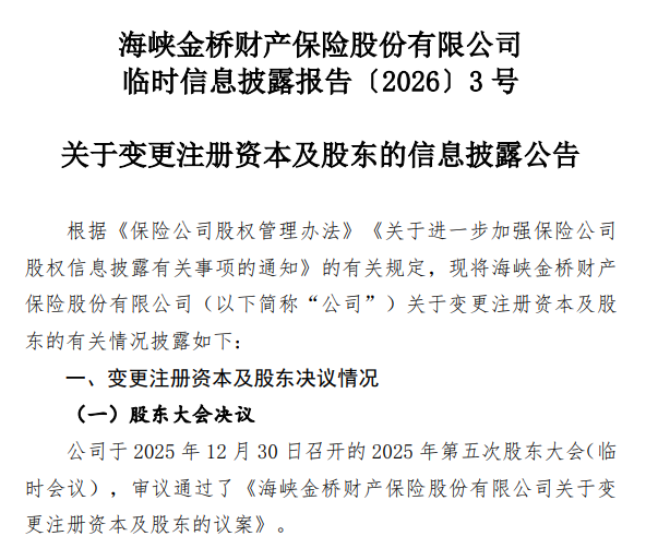 1月7日,海峡金桥财产保险股份有限公司(下称“海峡保险”)发布关于变更注册资本及股东的信息披露公告称,公司拟增资10亿元,发行股份32.26亿股,发行股份所得股款均计入公司注册资本,增资后注册资本变更为25亿元,待福建金融监管局批准后生效。