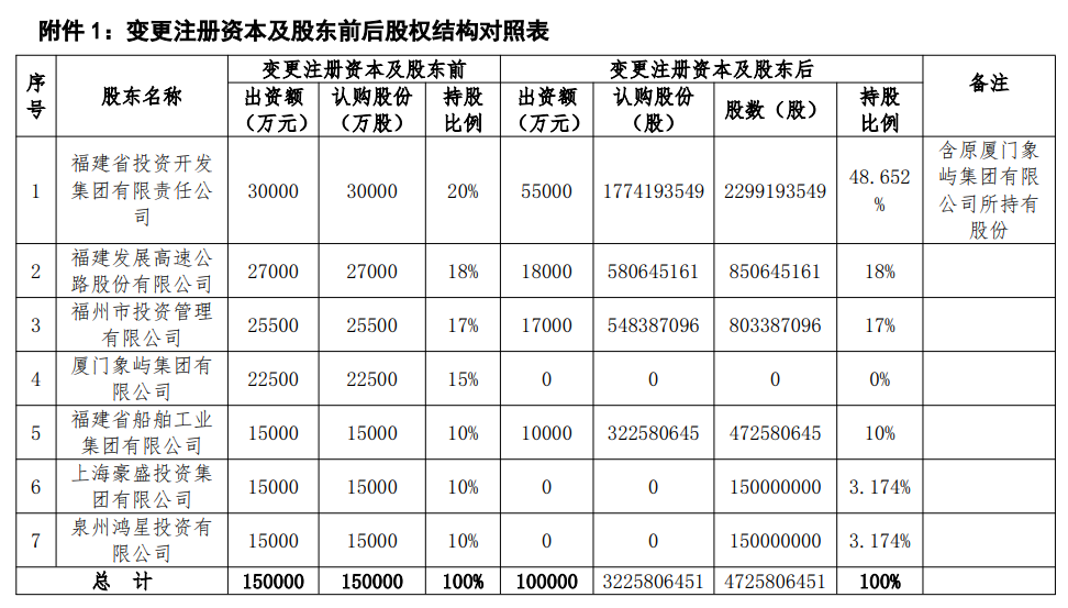 根据公告,此次变更注册资本无新增股东。福建省投资开发集团有限责任公司(下称“福建投资集团”)认购17.74亿股,总金额5.5亿元;福建发展高速公路股份有限公司(下称“福建高速”)认购5.81亿股,总金额1.8亿元;福州市投资管理有限公司(下称“福州投管”)认购5.48亿股,总金额1.7亿元;福建省船舶工业集团有限公司(下称“福船集团”)认购3.23亿股,总金额1亿元。
