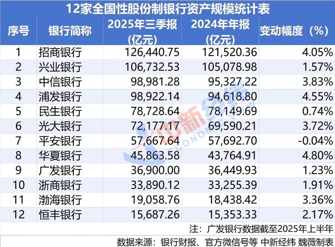 截至2025年三季度末,民生银行、光大银行、平安银行、华夏银行、浙商银行、渤海银行资产规模分别为7.87万亿元、7.22万亿元、5.77万亿元、4.59万亿元、3.39万亿元和1.91万亿元。