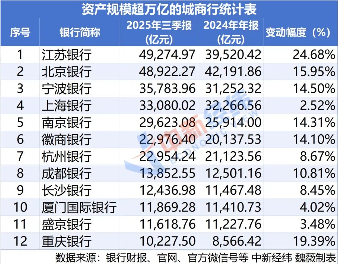 先来看城商行。截至2025年三季度末,江苏银行资产规模达4.93万亿元,反超北京银行,成为城商行资产规模第一名。2024年的城商行第一北京银行则降至第二位,资产规模为4.89万亿元。此外,宁波银行以资产规模3.58万亿元超过上海银行,暂居第三位。