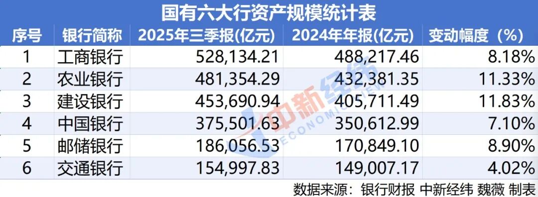 增幅方面,国有六大行中,建设银行的资产规模增幅最快,2025年三季度末较2024年末增长11.83%;其次是农业银行,以11.33%的增幅位居第二;邮储银行、工商银行、中国银行、交通银行增幅分别为8.90%、8.18%、7.10%和4.02%。