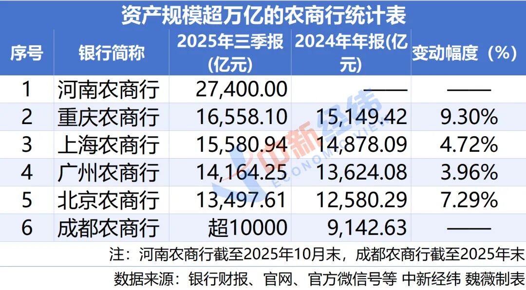农商行方面,2025年,资产规模达万亿级的农商行共有6家。