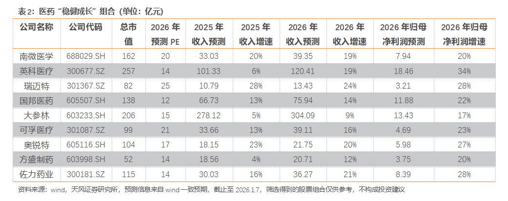 自2018年“4+7”带量采购启动以来,国内集采持续推进,覆盖范围逐步从化药扩大至耗材、中药、生物制品等领域,展望2026年,我们认为部分企业有望逐步消化短期影响,报表质量有望得到改善,同时受益于集采中选,企业的市场份额持续提升;此外,我们看到部分企业的研发管线逐步进入兑现期,“创新+出海”双轮驱动下,新产品接力增长,有望开启新一轮增长周期,如医疗耗材/中药/原料药等细分子版块。同时,我们看到部分企业既往经历了行业出清周期,行业集中度有望进一步提升,如药店板块。我们认为这类企业在集采环境下风险相对较低,且具备一定的增长驱动力,未来2-3年有望实现业绩稳健增长(不超过30%)且估值相对较低(PE不超过25倍);同时从持仓结构来看,交易拥挤度相对较低,因此将其归类为医药“稳健成长”组合。对于该组合我们认为从中线角度,有望带来一定的超额收益。