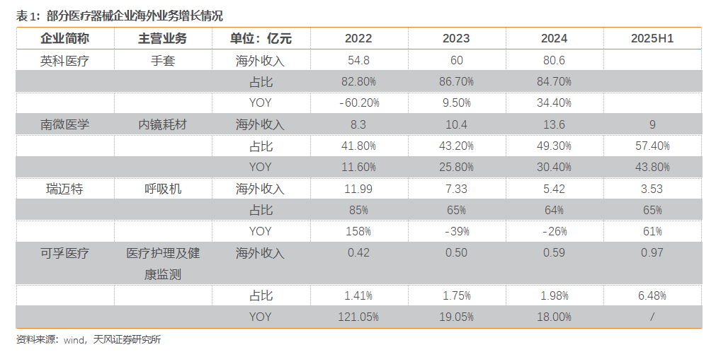截止2025年6月,国家带量采购已覆盖医疗器械的主要品类,在高值耗材、低值耗材领域全方位开展。2019-2024年,低值耗材和高值耗材的海外业务CAGR分别为13.98%、25.82%。国内的低值耗材企业则凭借成本优势和完整的产业链,承接海外OEM/ODM订单,形成稳定的代工模式。高值耗材出海位于起步阶段,但随着集采对高值耗材的影响愈加深刻,高值耗材出海谋求高利润的进程已为大势所趋。相关标的:南微医学、英科医疗、瑞迈特、可孚医疗。