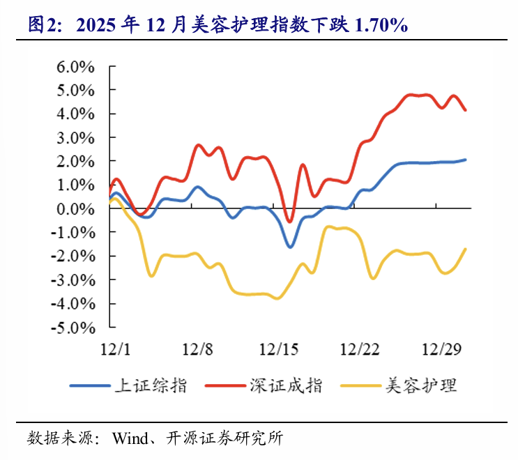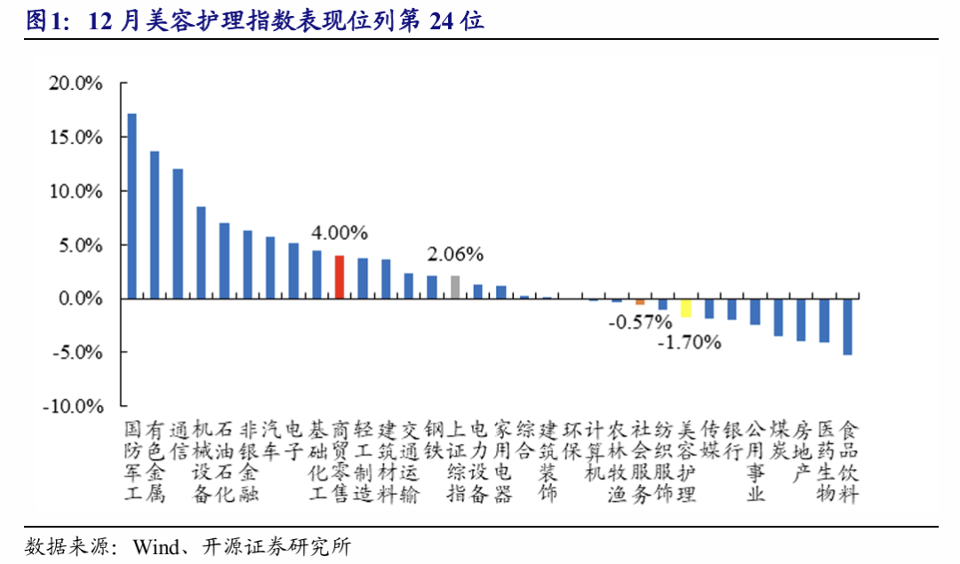 医美(选取13家上市公司):12月个股涨幅靠前为美丽田园医疗健康(+7.9%)、锦波生物(+7.6%)、复锐医疗科技(+2.9%);化妆品(选取20家上市公司):12月个股涨幅靠前为水羊股份(+16.2%)、青松股份(+15.5%)、嘉亨家化(+3.1%)。