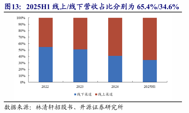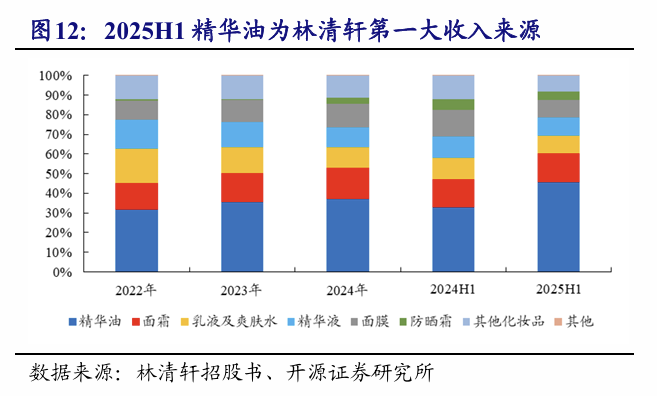 公司精华油业务和线上渠道贡献核心营收,OMO模式驱动全渠道增长。分业务看,2025H1公司总营收达10.5亿元,同比增长98.3%,其中品牌“林清轩”贡献绝大部分收入,2025H1营收为10.4亿元占比高达99.1%。林清轩聚焦于面部护肤,2025H1精华油/面霜/乳液及爽肤水/精华液/面膜/防晒霜和其他化妆品营收占比分别为45.5%/14.6%/9.3%/9.1%/9.0%/4.0%/8.5%,基本盘是以“山茶花面部精华油”为代表的精华油品类,其收入占比稳步提升。分渠道看,2025H1线上/线下营收占比分别为65.4%/34.6%,线下渠道以高端商场直营店为主,线下直营店占比为24.0%;线上渠道增长强劲,得益于抖音等兴趣电商的快速扩张,线上以直销为主占比达58.6%,呈现持续上升趋势。公司毛利率稳居高位,2025H1林清轩综合毛利率82.4%,其中精华油/精华液/面霜毛利率分别为86.2%/85.0%/83.8%。