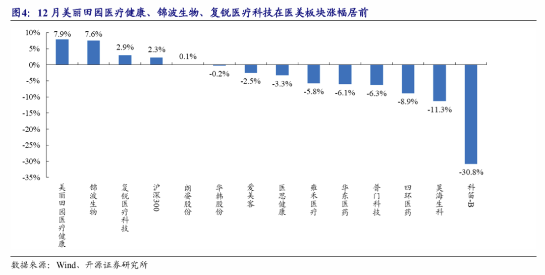 12月,美丽田园医疗健康、锦波生物、复锐医疗科技在医美板块涨幅居前。我们选取的13家医美上市公司(含新三板挂牌公司)中12月共计4家上涨、9家下跌。其中,月涨幅靠前的为美丽田园医疗健康、锦波生物、复锐医疗科技,月涨幅分别为7.9%、7.6%、2.9%;月表现靠后的为四环医药、昊海生科、科笛-B。