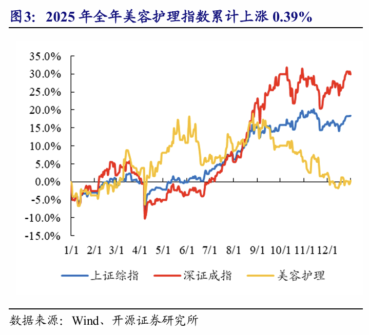 12月美容护理指数下跌1.70%,位列第24位。美容护理指数12月报收4375.58点,月跌幅为1.70%,在所有一级行业中位列第24位,表现弱于大盘(12月上证综指上涨2.06%)。此外,2025年全年,美容护理行业指数累计上涨0.39%,表现弱于大盘(2025年全年上证综指累计上涨18.41%)。