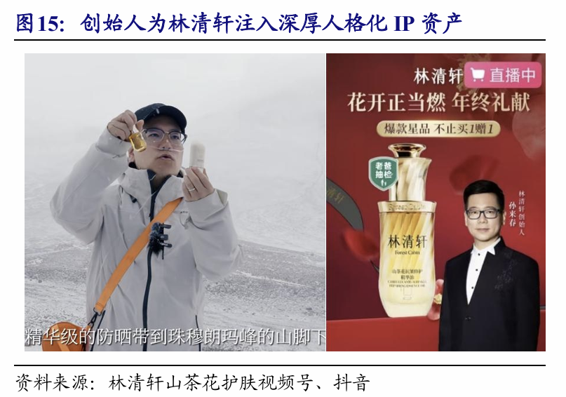 品牌端:深耕红山茶花文化,通过传统植物融合现代技术+全方位IP矩阵+沉浸体验奠定高端心智。林清轩深耕中国传统植物,通过深挖《山海经》等典籍中山茶花的传统护肤智慧,将东方美学与现代科技相融合,打造具备文化底蕴的差异化产品以唤起情感共鸣,确立了“山茶花油=林清轩”的高端行业标杆地位。同时,公司构建多元IP矩阵,尤其是创始人极具个人魅力与品牌精神,其创业故事、对红山茶花文化的执着挖掘以及亲自下场直播的亲和力,为品牌注入了深厚的人格化IP资产。此外,公司通过“山茶花溯源之旅”等沉浸式体验,邀请客户亲临种植与科研基地,全方位强化品牌高端认知与艺术调性。
