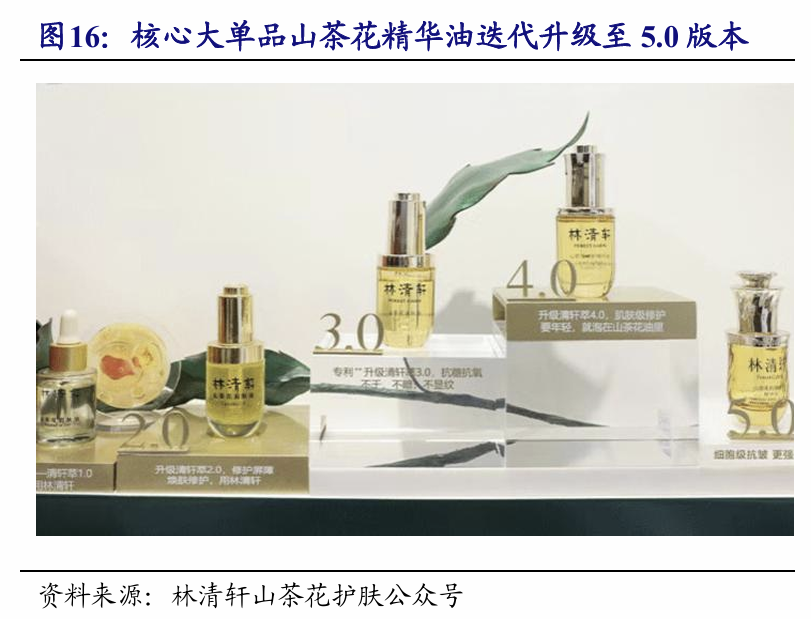 产品端:首创“以油养肤”理念,围绕超级大单品构建全品类高增长矩阵。公司是行业内少数成功打造热销十年经久不衰产品的护肤品牌之一,产品开发核心围绕中国特色植物成分“红山茶花”及独家核心原料。截至2025H1,林清轩已构建起以“山茶花修护精华油”为核心,覆盖面霜、水乳、精华液、面膜及防晒霜等全品类的抗皱修护矩阵合计共230个SKU。核心大单品山茶花抗皱修护精华油自2014年推出以来,已历经五次迭代升级,凭借卓越的修护抗皱功效和肤感,成为唯一一款中国面部精华油品类中连续8年零售额破亿的产品。此外,“以油带面”连带销售成效显著,新品类迅速放量,2025H1山茶花焕亮精华霜和高倍隔离防晒霜分别实现收入0.5/0.4亿元均成为热销产品,展现了公司对消费者偏好深刻洞察及持续创新能力。在 2025 年双十一电商大促中,林清轩均为2025 年双十一抖音大促“化妆水类目”和“面部精油芳疗类目”榜首。