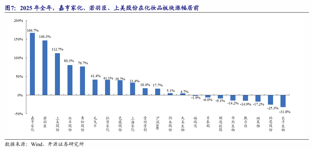 2025年全年,嘉亨家化、若羽臣、上美股份在化妆品板块中涨幅居前。2025年1-12月,化妆品板块所选公司中共12家上涨、8家下跌。其中,嘉亨家化、若羽臣、上美股份在化妆品板块中涨幅居前,累计涨幅分别为166.7%、146.3%、112.7%;2025年1-12月跌幅靠前的分别为珀莱雅、科思股份、巨子生物。