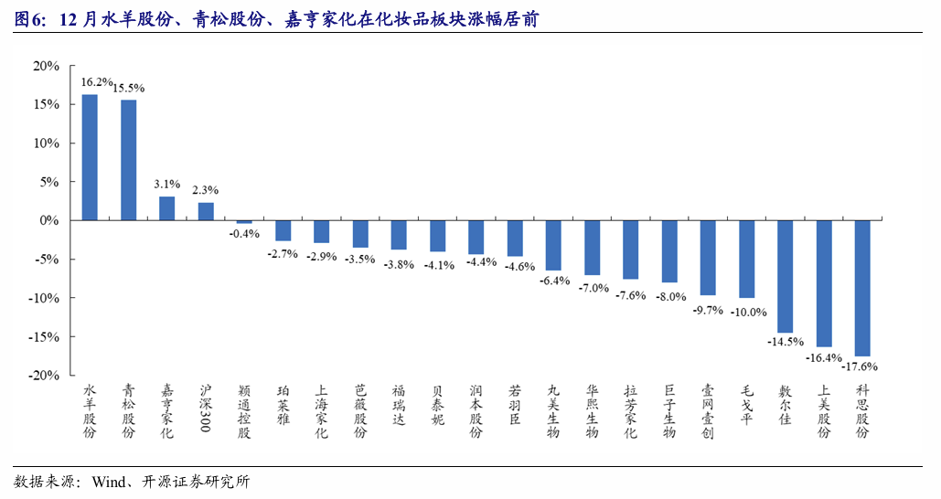 12月,水羊股份、青松股份、嘉亨家化在化妆品板块涨幅靠前。在我们选取的20家化妆品上市公司中,12月共计3家上涨、17家下跌。其中,12月涨幅靠前的为水羊股份、青松股份、嘉亨家化,月涨幅分别为16.2%、15.5%、3.1%;月跌幅靠前的分别为敷尔佳、上美股份、科思股份。