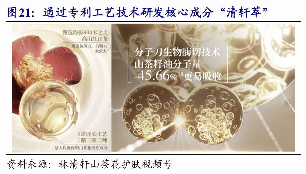 研发端:全产业链科研布局,独家成分“清轩萃”构筑技术壁垒。公司坚持“全产业链”发展,是面部精华油市场唯一实现全价值链一体化的企业,能够持续通过技术创新迭代核心成分,不断提升产品的功效壁垒。在原料端,公司在浙江及江西等地战略锁定超2万亩高山红山茶花种植基地,从源头把控原料品质与供应稳定。在科研端,拥有由85名专家组成的跨学科团队,并设立专门的细胞级实验室,通过“三精、三萃、三纯化”等专利工艺,成功研发出核心活性成分“清轩萃”及山茶超胜肽等特有成分,截至2025年12月8日,已获87项专利,含46项发明专利,掌握分子刀定向生物酶切等前沿技术。