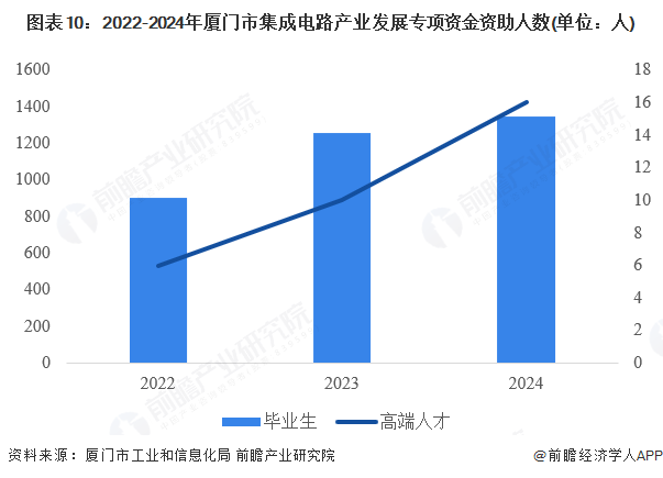 根据厦门市工业和信息化局披露的数据,为响应2022年出台的《厦门市人民政府关于印发进一步加快推进集成电路产业发展若干措施的通知》政策,全市集成电路产业发展专项资金的毕业生及高端人才数量每年逐年增加,2022年受资助的毕业生为902人,高端人才6人;而在2024年,这一数据增至1345人,高端人才数量也增加至16人,体现了厦门市政府越来越注重对集成电路人才的培养和支持,为全市集成电路产业发展创造优质动能,持续激发集成电路产业发展增长态势,优化产业劳动力结构。