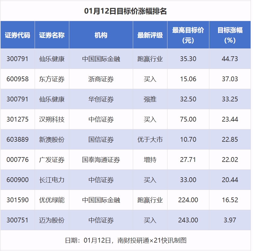 南财投研通数据显示,1月12日,券商给予上市公司目标价共9次,按最新收盘价计算,目标价涨幅排名居前的公司有仙乐健康、东方证券、汉朔科技,目标价涨幅分别为44.73%、37.03%、23.44%,分别属于食品加工、证券、食品加工行业。