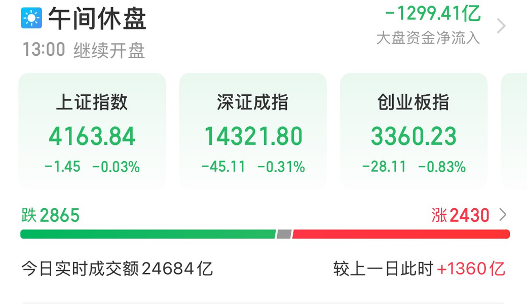 A股三大指数集体下跌,截至午盘,沪指跌0.03%,深成指跌0.31%,创业板指跌0.83%,北证50指数跌0.27%,沪深京三市半日成交额24684亿元,较上日放量1360亿元。全市场超2800只个股下跌。