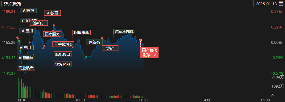 盘面上,医疗服务板块走强,诺思格(301333)、普蕊斯(301257)、泓博医药(301230)20CM涨停封板,百花医药(600721)、澳洋健康(002172)等数只个股涨停封板。Ai应用板块冲高震荡,挂怒与科技、天龙集团(300063)、迪安诊断(300244)等数只个股20CM涨停,省广集团(002400)、用友网络(600588)、利欧股份(002131)等数十只个股封板。贵金属板块活跃,湖南白银(002716)逼近涨停,晓程科技(300139)张超9%。商业航天板块调整,邵阳液压(301079)、过客竣工、海昌新材(300885)等跌超10%,北斗星通(002151)、普利特(002324)、航天科技(000901)等数十只个股跌停。