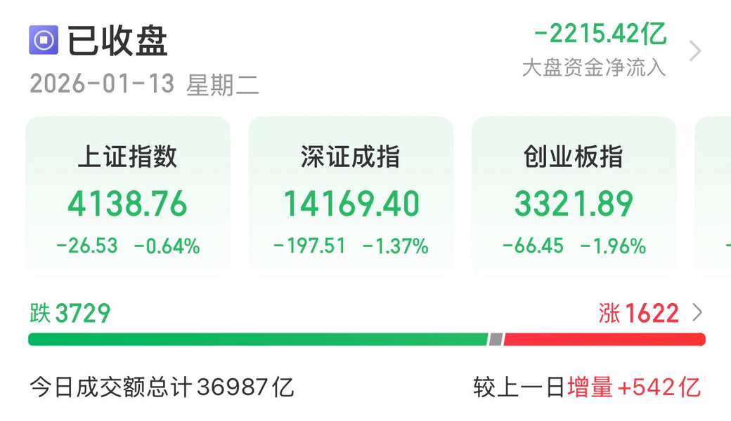 截至收盘,上证指数跌0.64%报4138.76点,深证成指跌1.37%报14169.40点,创业板指跌1.96%报3321.89点,北证50跌2.5%报1565.58点。全市场成交额36987亿元,较上日成交额放量541亿元。