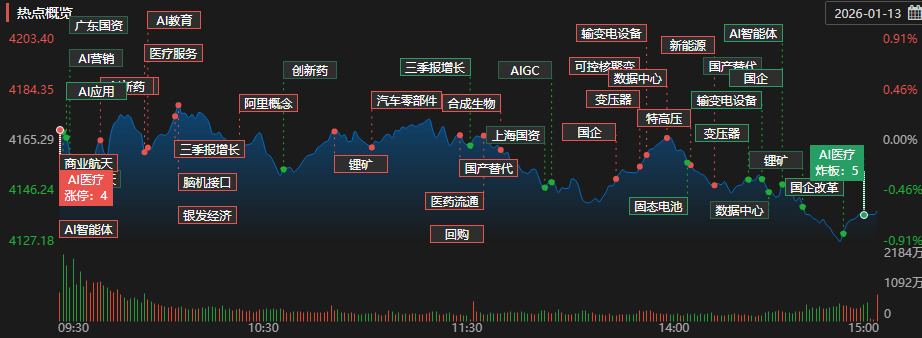 板块题材上,医疗服务、AI应用、贵金属板块活跃,商业航天板块调整。