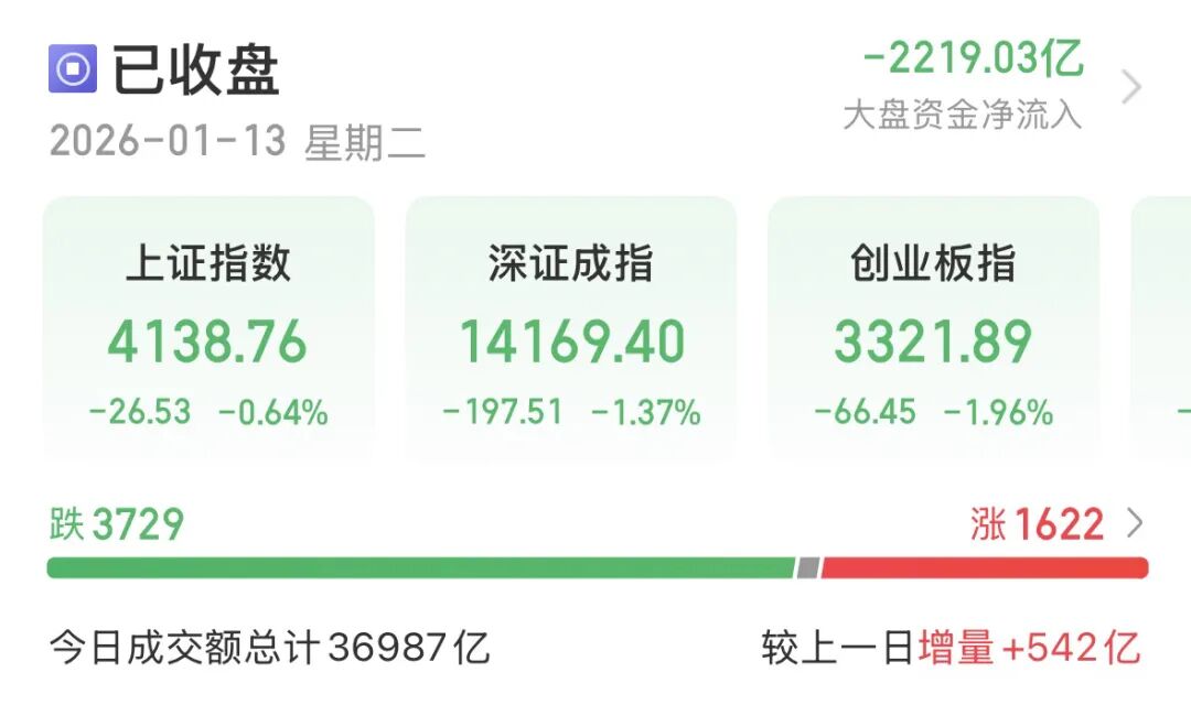 1月13日,A股放量回调,成交额再刷纪录至3.7万亿元。商业航天降温,卫星ETF(交易型开放式指数基金)集体回吐;科技股领跌,创业板指跌近2%;沪指止步17连阳。
