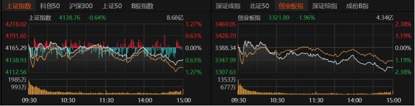 石油石化、银行护盘,沪指微跌0.64%,止步17连阳;国防军工、电子、通信、计算机、机械设备板块回调,创业板指收跌1.96%报3321.89点;深证成指收跌1.37%。科创50、北证50跌幅均超过2%,沪深300、上证50微跌。