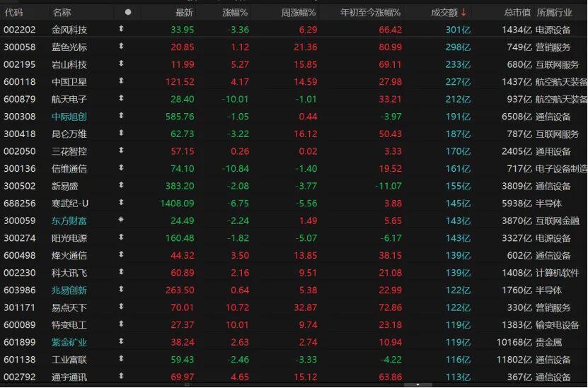 市场共计3729只个股下跌,跌停股56只;1622只个股收涨,涨停股75只。30只个股日成交额不低于100亿元,金风科技日成交额超过300亿元,收跌3.36%报33.95元/股,蓝色光标股价微涨,昆仑万维股价跌逾3%;航天电子、航天发展、中国卫通跌停,中国卫星涨幅超过4%;中际旭创、新易盛、天孚通信均收跌。