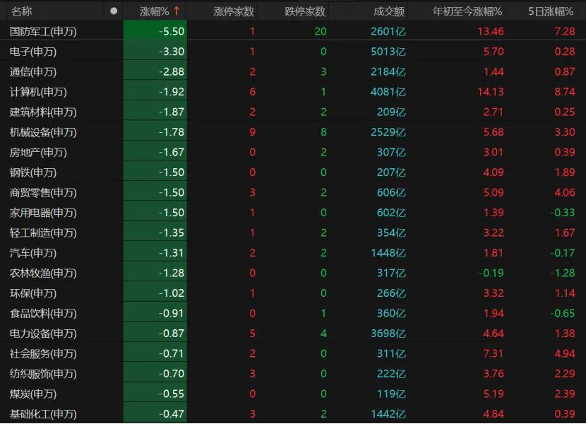 25个申万一级行业板块收绿,国防军工、电子、通信、计算机等板块领跌。