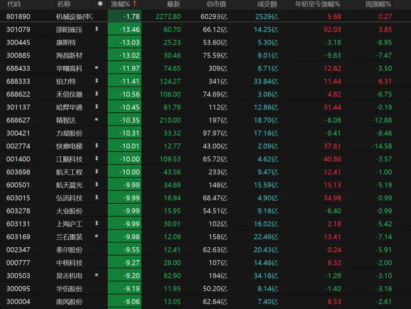 机械设备板块分化明显,山东墨龙、展鹏科技、巨力索具等9只个股涨停。8只机械设备个股跌停,邵阳液压跌逾13%报60.7元/股,康斯特、海昌新材、华曙高科、铂力特跌幅均超过10%,快意电梯、江顺科技、航天工程、航天晨光、弘讯科技、大业股份、上海沪工等均跌停。