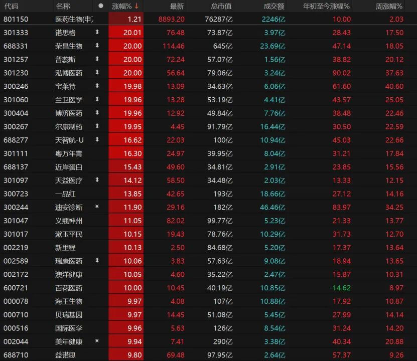 医药生物表现不错,16只个股涨停,诺思格、荣昌生物、普蕊斯、泓博医药、宝莱特、兰卫医学、博济医药、尔康制药20cm”涨停。