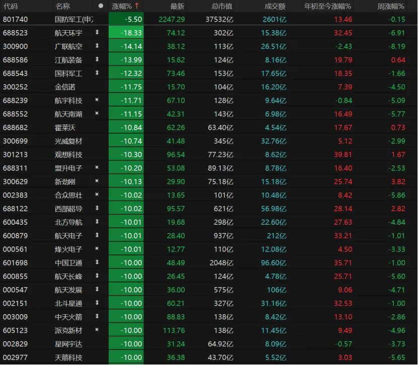 国防军工板块降温,20只相关个股跌停,航天环宇跌幅超过18%,合众思壮、西部超导、北方导航、航天电子、烽火电子、中国卫通、航天长峰、航天发展等均跌停。