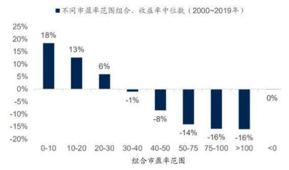 统计分析显示,长期来看,低估值策略有明显的超额收益。市盈率在10倍以下(不含亏算市盈率为负股票)组合的收益率中位数高达18%,远远领先其他各个市盈率范围组合的收益率中位数,而且可以发现,组合收益率的中位数与组合市盈率高低呈现出非常强烈的负向关系,即组合的市盈率越低收益率越高。