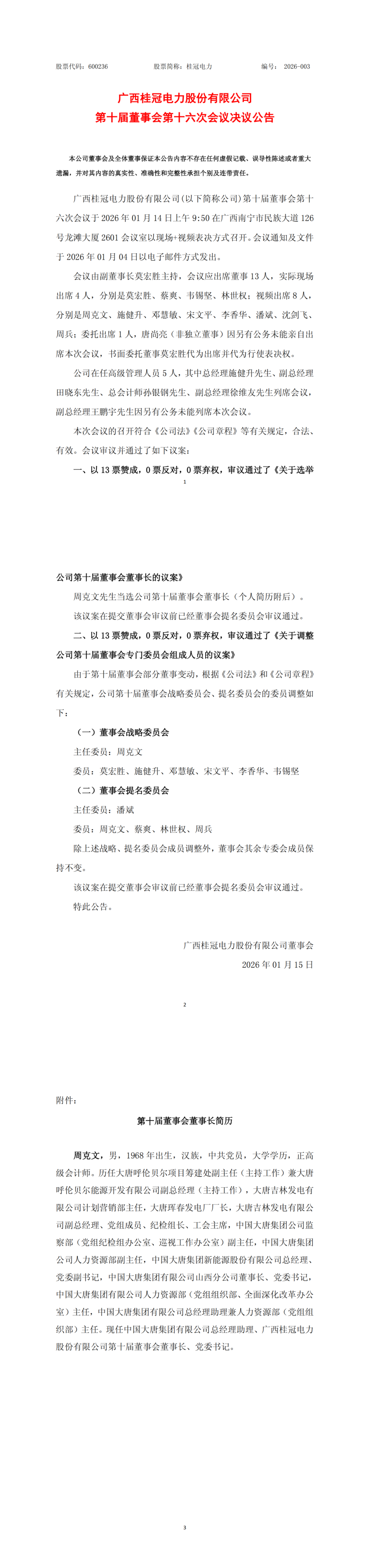 1月14日,广西桂冠电力股份有限公司(桂冠电力 600236.SH)第十届董事会第十六次会议召开。会议审议通过了《关于选举公司第十届董事会董事长的议案》,周克文先生当选桂冠电力第十届董事会董事长。该议案在提交董事会审议前已经董事会提名委员会审议通过。