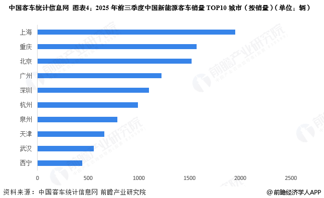 根据2025年前三季度中国新能源客车销量情况来看,前10企业销量占比高达41.5%,排名前三的城市分别为上海、重庆以及北京,销量分别为1949辆、1567辆以及1521辆,整体来看,发达城市新能源客车销量较高。