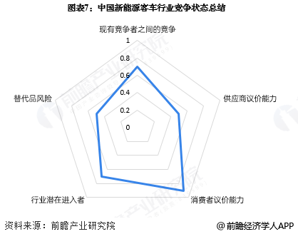 根据以上分析,对各方面的竞争情况进行量化,1代表最大,0代表最小,得到目前我国新能源客车行业竞争较为激烈,具体五力竞争总结如下: