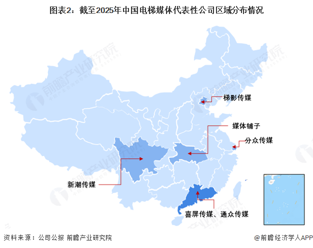 中国电梯媒体代表性公司主要分布在广东、四川、湖北、上海、北京等省市。其中,广东省的电梯媒体代表性公司数量较多,包括喜屏传媒、通众传媒等。