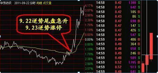 11年9.23日华芳纺织涨停,9.22日大盘下跌69点时该股尾盘迅速拉升4%。大跌之下大幅度走高,预示着第二天会有动作,即使不如华芳纺织般涨停也会有冲高动作,在前一天尾盘拉升时介入第二天有较好的获利机会。
