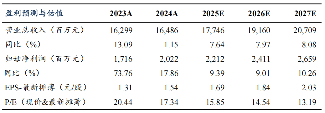 我们维持公司2025-2027年归母净利润预测为22/24/27亿元,当前市值对应PE 16/15/13X,维持“增持”评级。